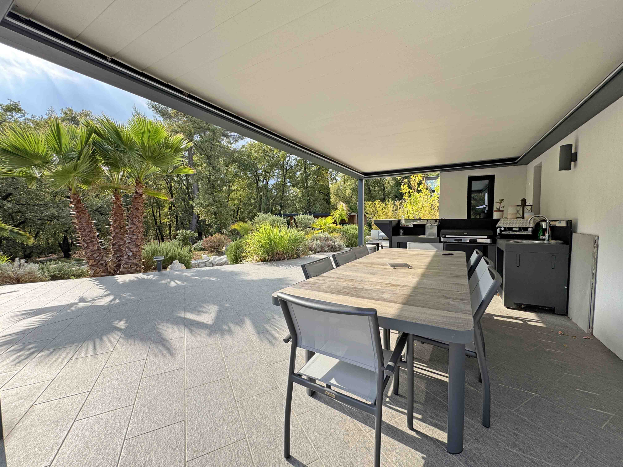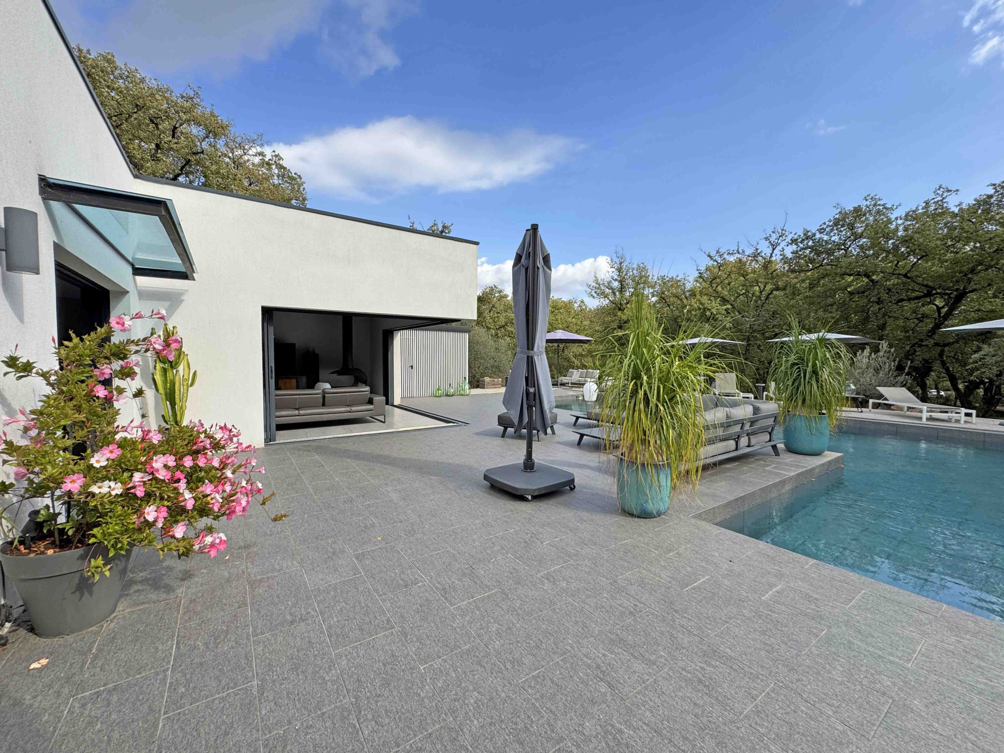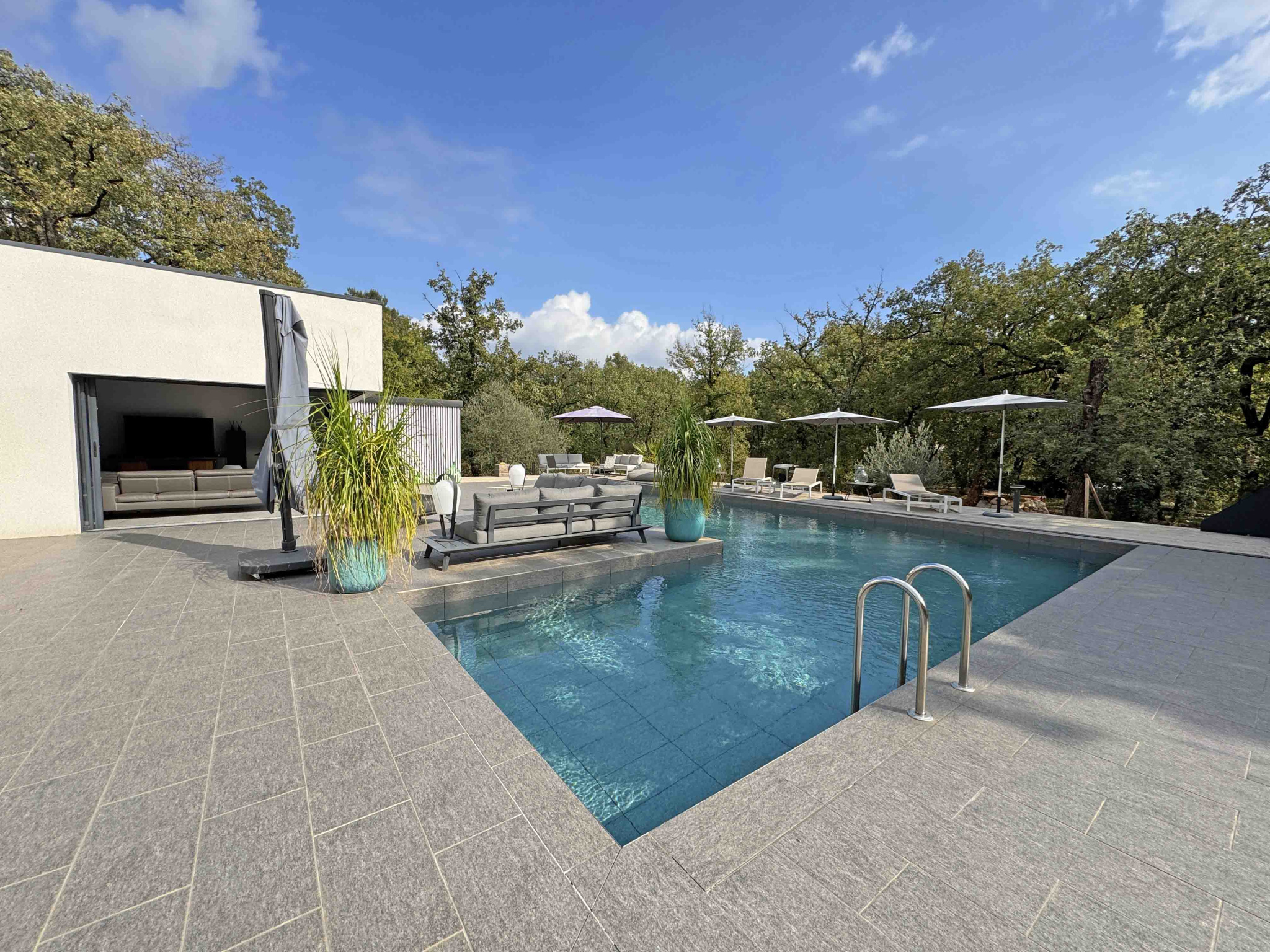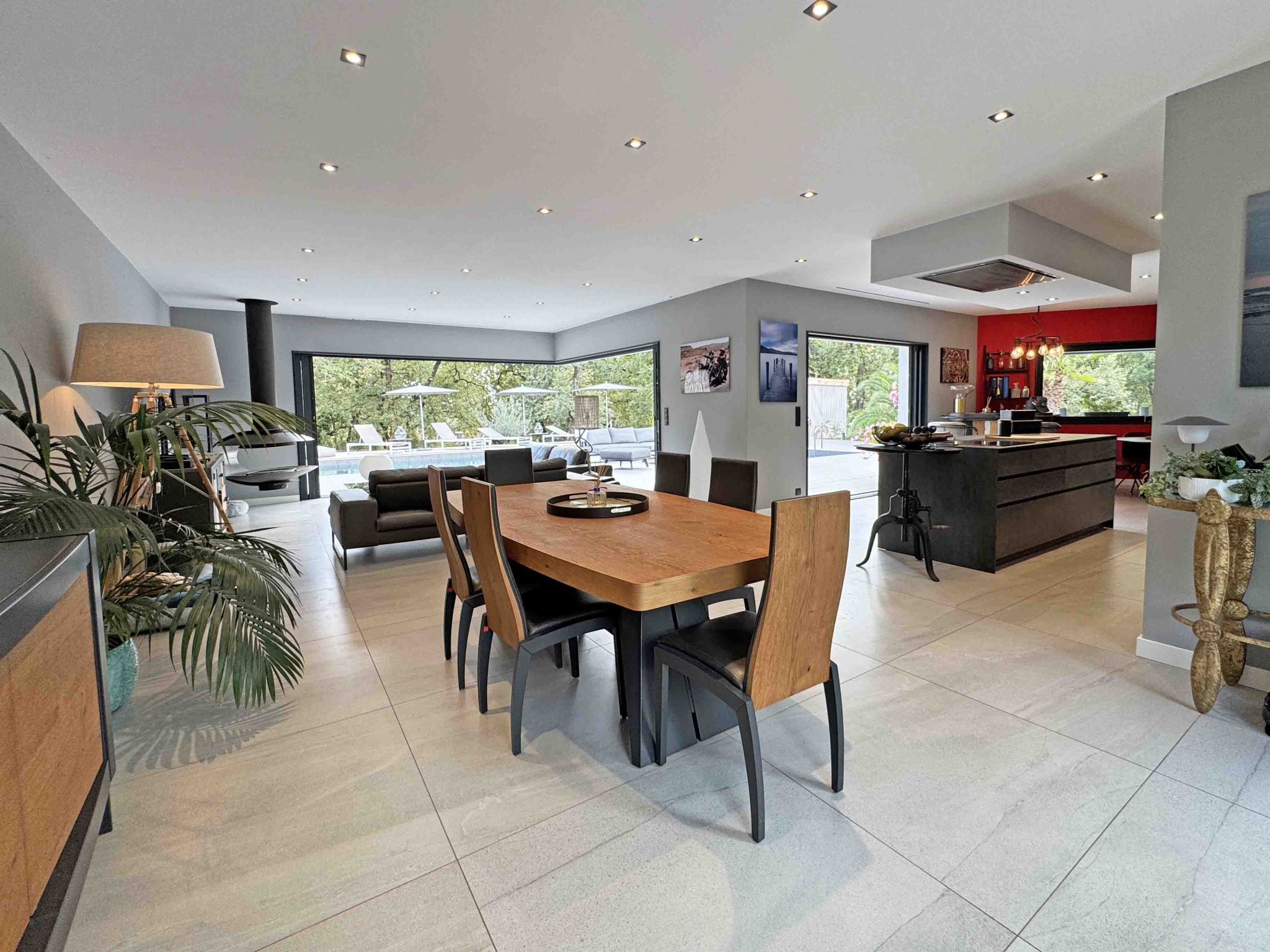 Villa contemporaine de plain-pied de 170 m2 et de 4 pièces principales comprenant : Séjour avec cheminée et cuisine équipée, une chambre de Maîtres avec placard, salle de douches et WC en suite, deux chambres avec placard, deux salles de douches avec WC, un cellier/buanderie, Terrain en majeure partie classé boisé de 15.000 m2 avec piscine, cuisine d'été et garage.