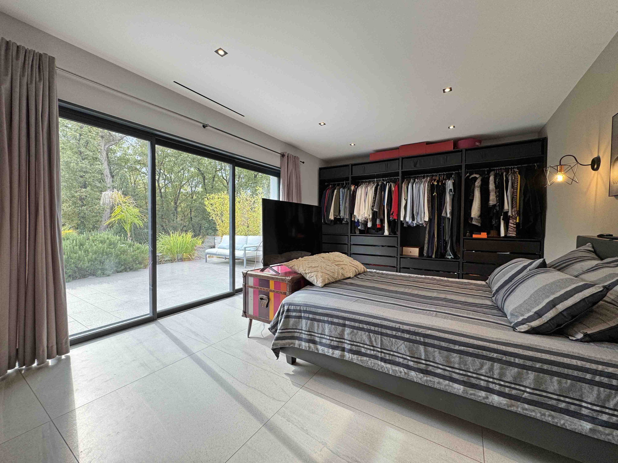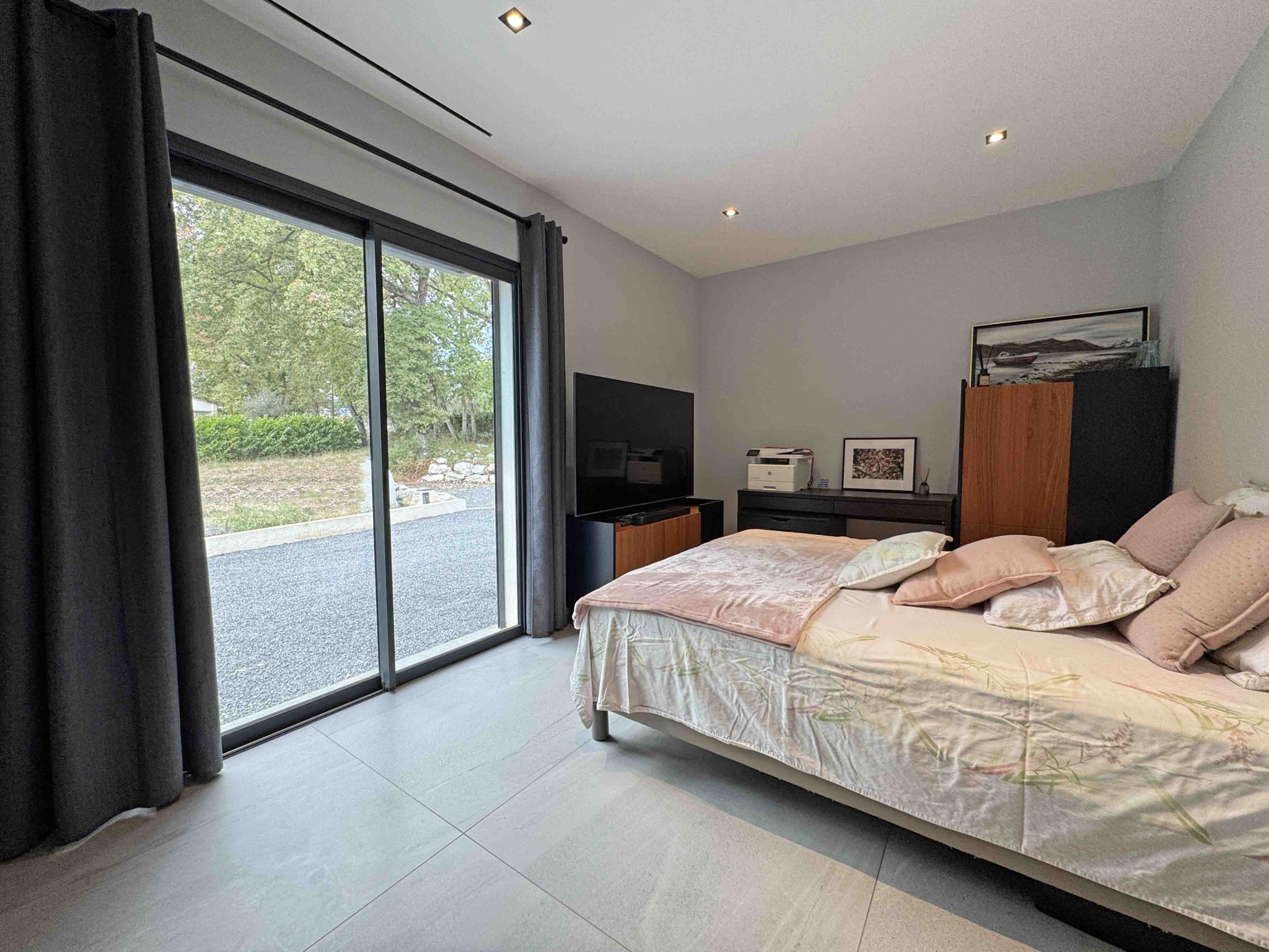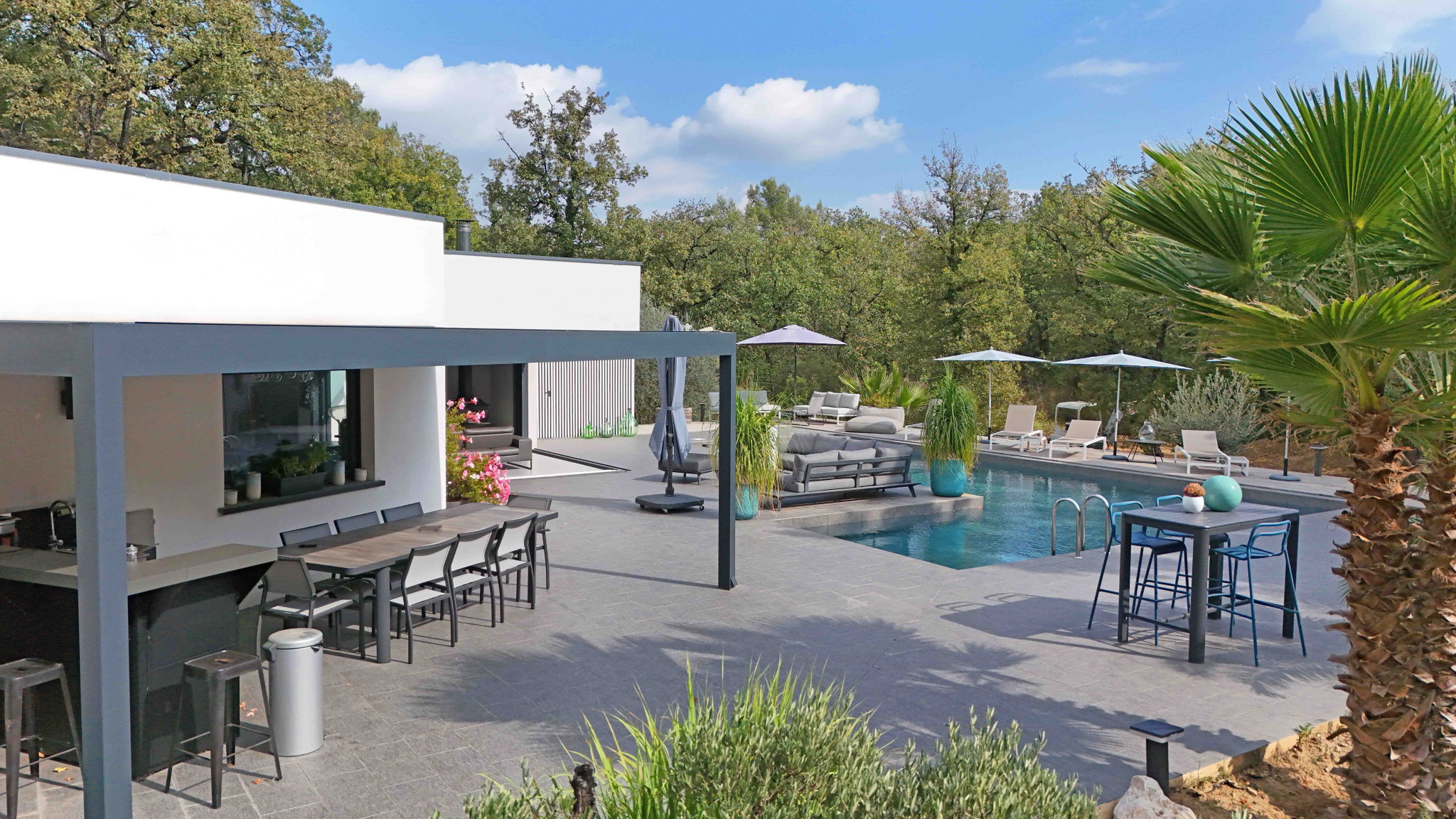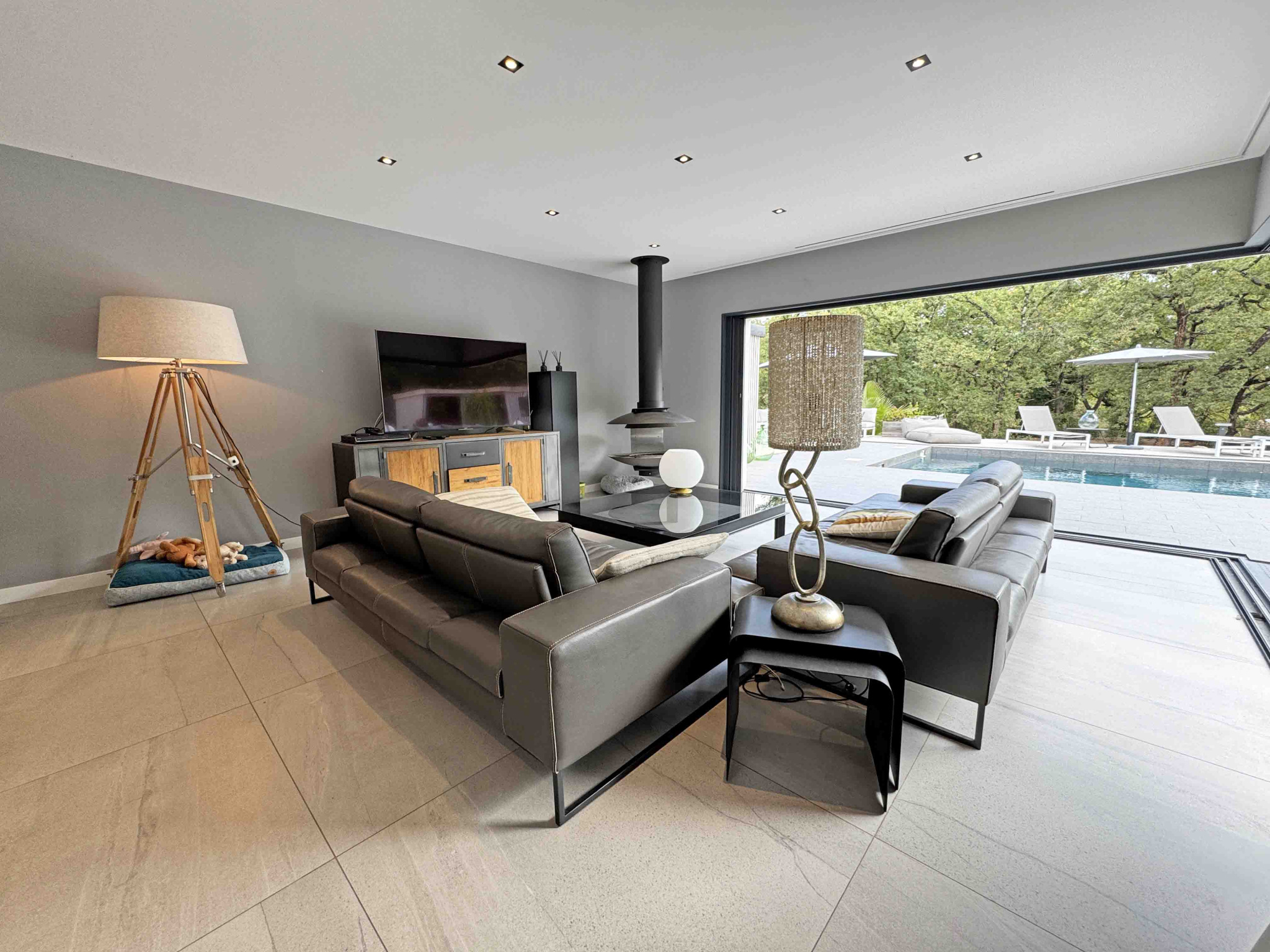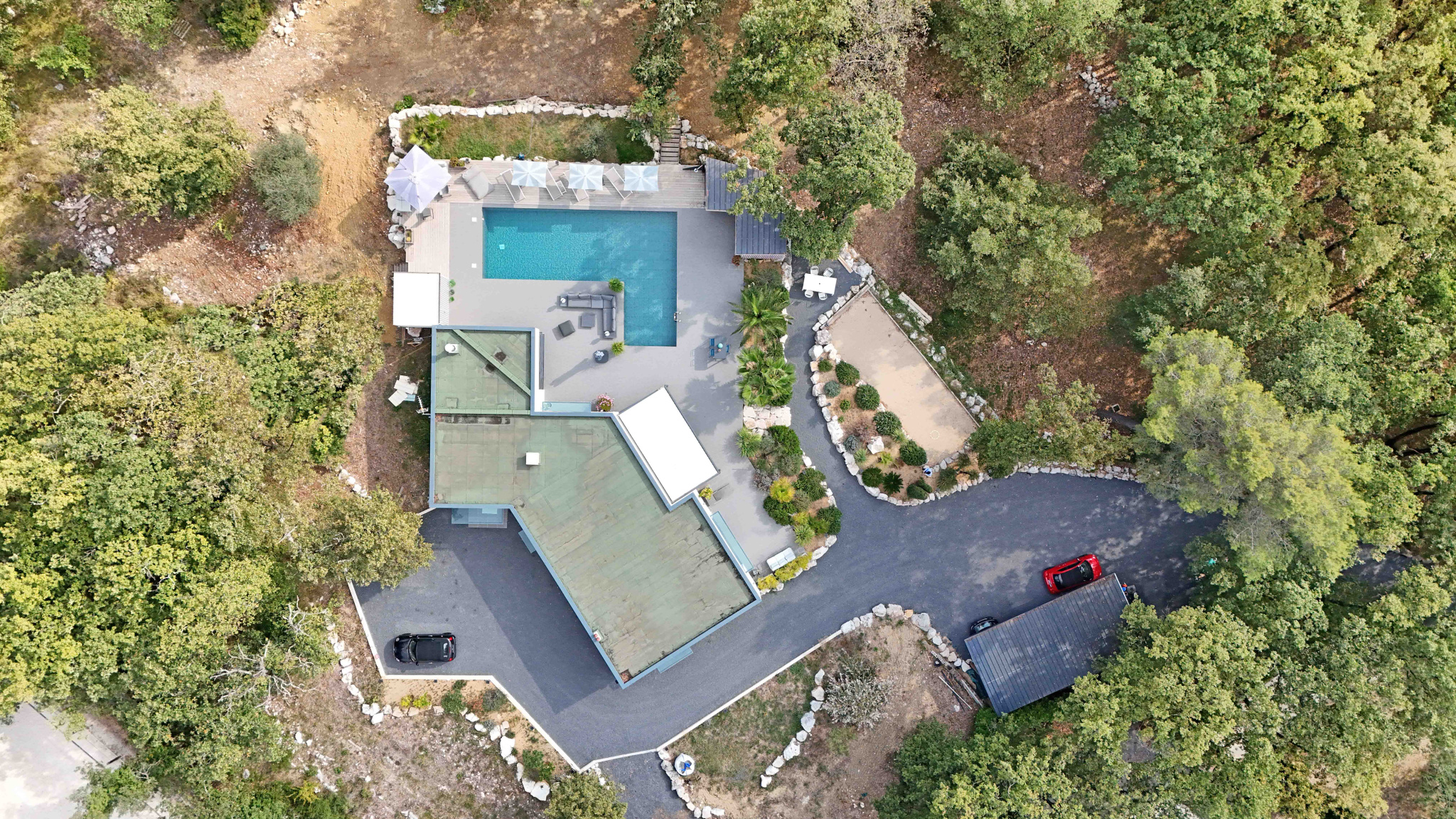 Villa contemporaine de plain-pied de 170 m2 et de 4 pièces principales comprenant : Séjour avec cheminée et cuisine équipée, une chambre de Maîtres avec placard, salle de douches et WC en suite, deux chambres avec placard, deux salles de douches avec WC, un cellier/buanderie, Terrain en majeure partie classé boisé de 15.000 m2 avec piscine, cuisine d'été et garage.