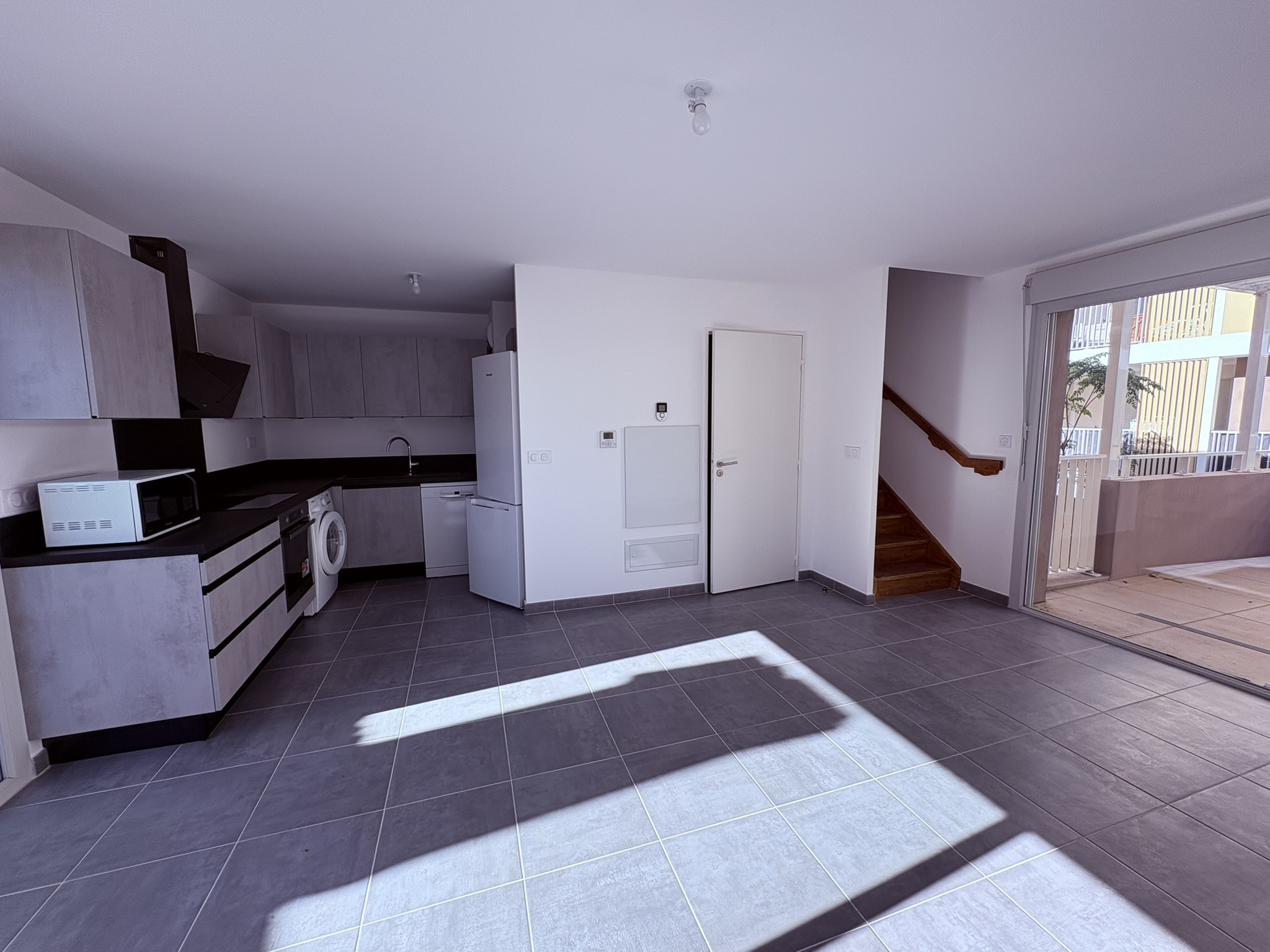 VENCE - Au coeur du Centre-Ville, dans un immeuble neuf, appartement 3P en duplex. Il se compose d'une pièce de vie lumineuse avec cuisine ouverte entièrement équipée (plaque, hotte, four, réfrigérateur, lave-vaisselle, lave-linge, micro-ondes). WC indépendant. A l'étage : deux chambres et une salle d'eau avec WC. Terrasse de 12m2. Une place de parking en sous-sol. LIBRE IMMEDIATEMENT. Loyer CC : 1200 euros dont 40 euros (entretien général de la copropriété) / Dépôt de garantie : 1160 euros / Honoraires d'agence TTC : 749,71 euros (576,70 euros + 173,01 euros pour l'EDL d'entrée)