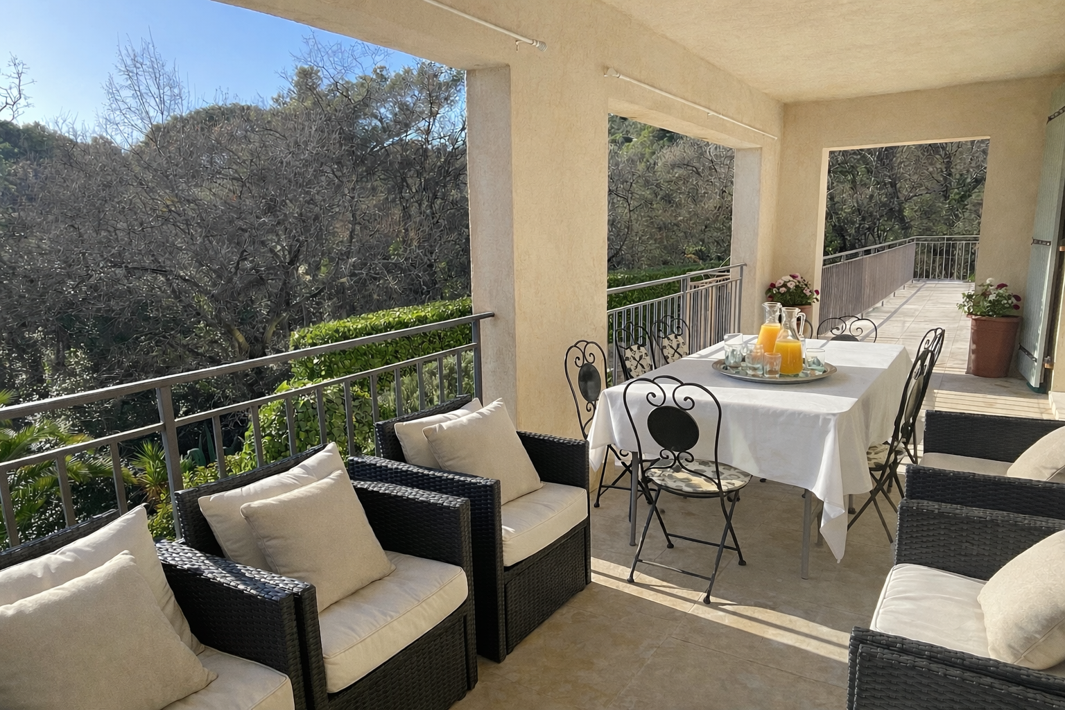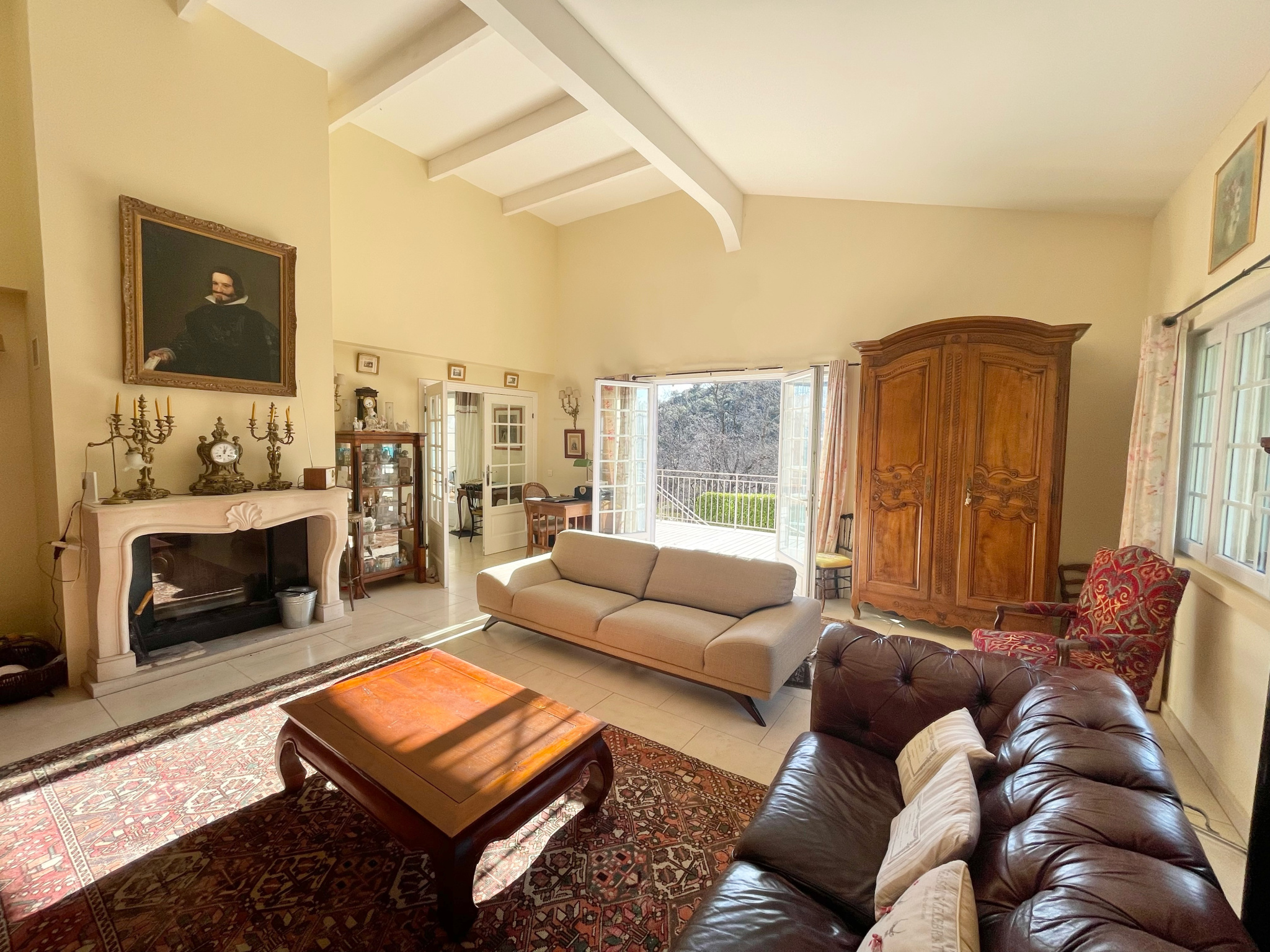 EXCLUSIVITE - A 5 minutes du charmant village médiéval de Tourrettes sur Loup, découvrez cette magnifique villa exposée plein Sud, au calme avec une belle vue dégagée sur les collines boisées. Construction de qualité offrant un grand confort : chauffage par le sol avec pompe à chaleur neuve, double vitrage, climatisation réversible, cheminée avec insert, alarme. Cette villa de 180m² propose de beaux volumes intérieurs avec ses grandes hauteurs sous plafond. Entrée, grand séjour avec cheminée, plafond cathédrale, belle cuisine équipée (plan de travail en pierre) ouvrant sur la salle à manger, bureau/5ème chambre, wc indépendant, buanderie/chaufferie. Grande terrasse couverte. Empruntez un bel escalier pour aller à l'étage : chambre de maître avec accès à un grenier et à une belle terrasse, salle d'eau avec douche à l'italienne et wc, chambre 2 avec salle d'eau et wc, Chambre 3 et 4, salle de bains complète avec douche, baignoire et wc. Grande hauteur sous plafond dans toutes les chambres. Belles terrasses. A l'extérieur, profitez d'une piscine et sa belle terrasse donnant sur un terrain de 2.500m² en restanques. En complément : un beau chalet de jardin, de nombreux stationnements et une fosse septique "aux normes". L'avis de l'agence : cette propriété très bien entretenue est en parfait état, elle allie confort et sérénité dans un cadre verdoyant. Toutes les pièces sont grandes et agréables ouvrant sur des terrasses. Si vous recherchez une villa de qualité, une visite s'impose !