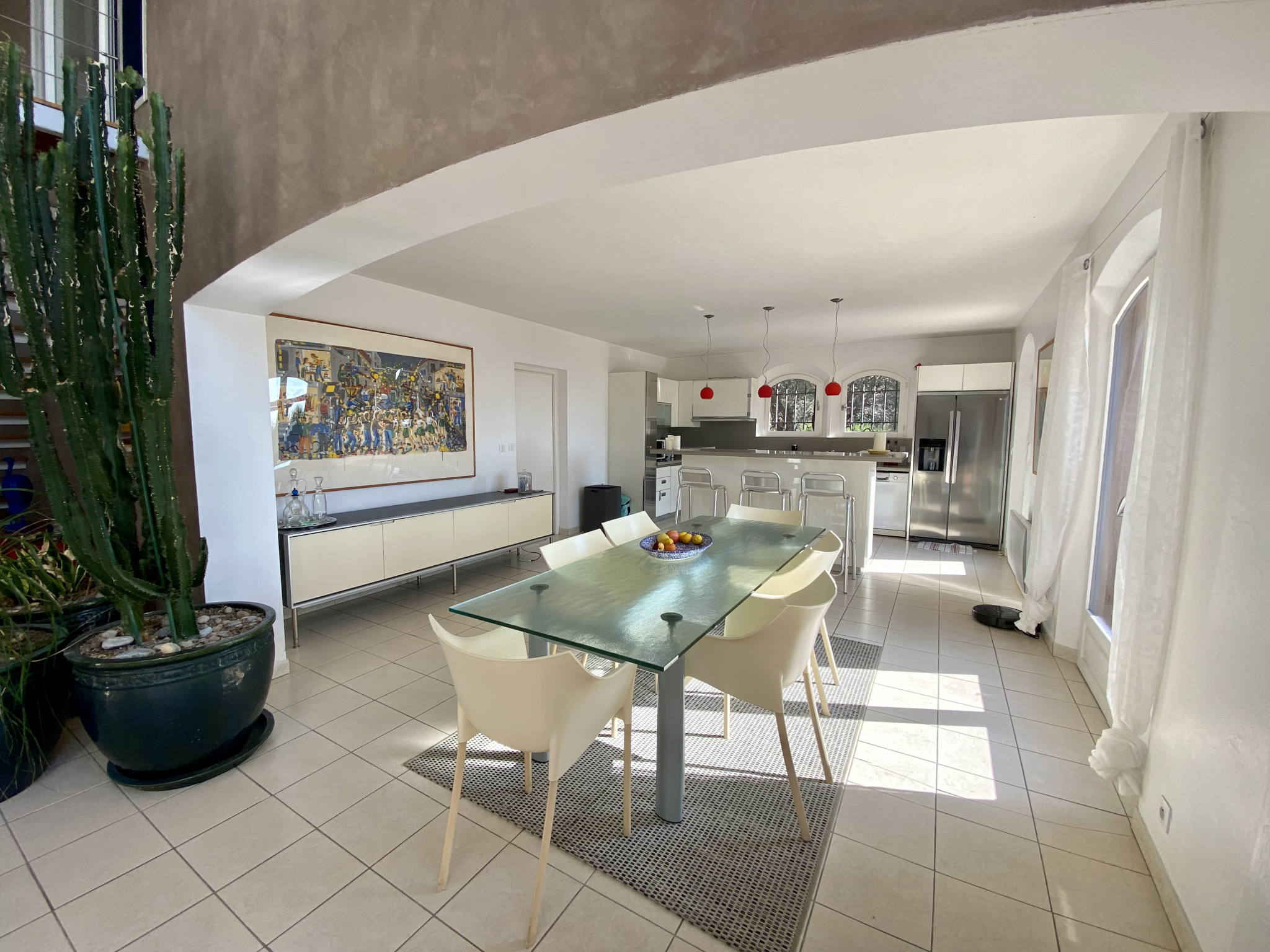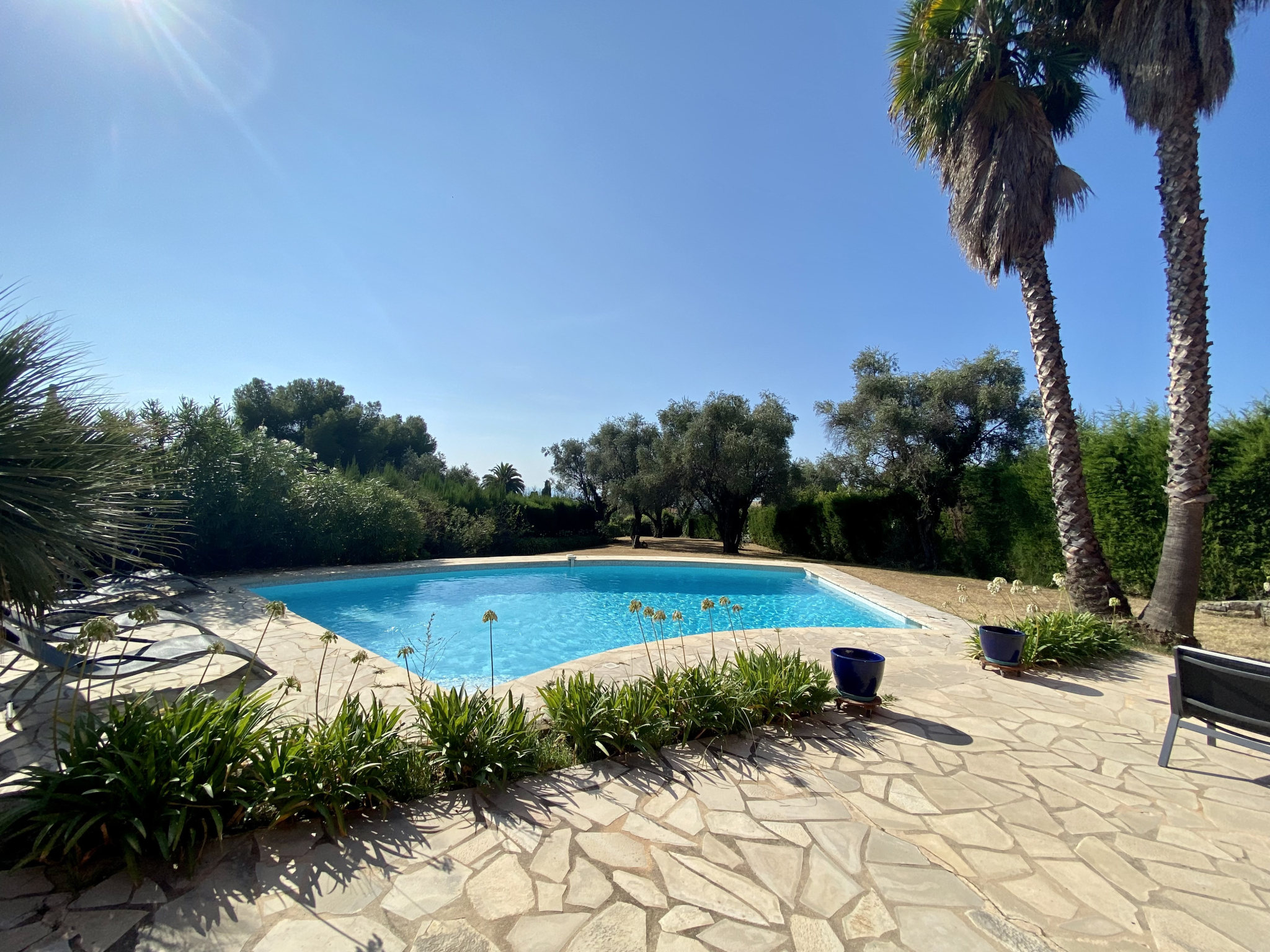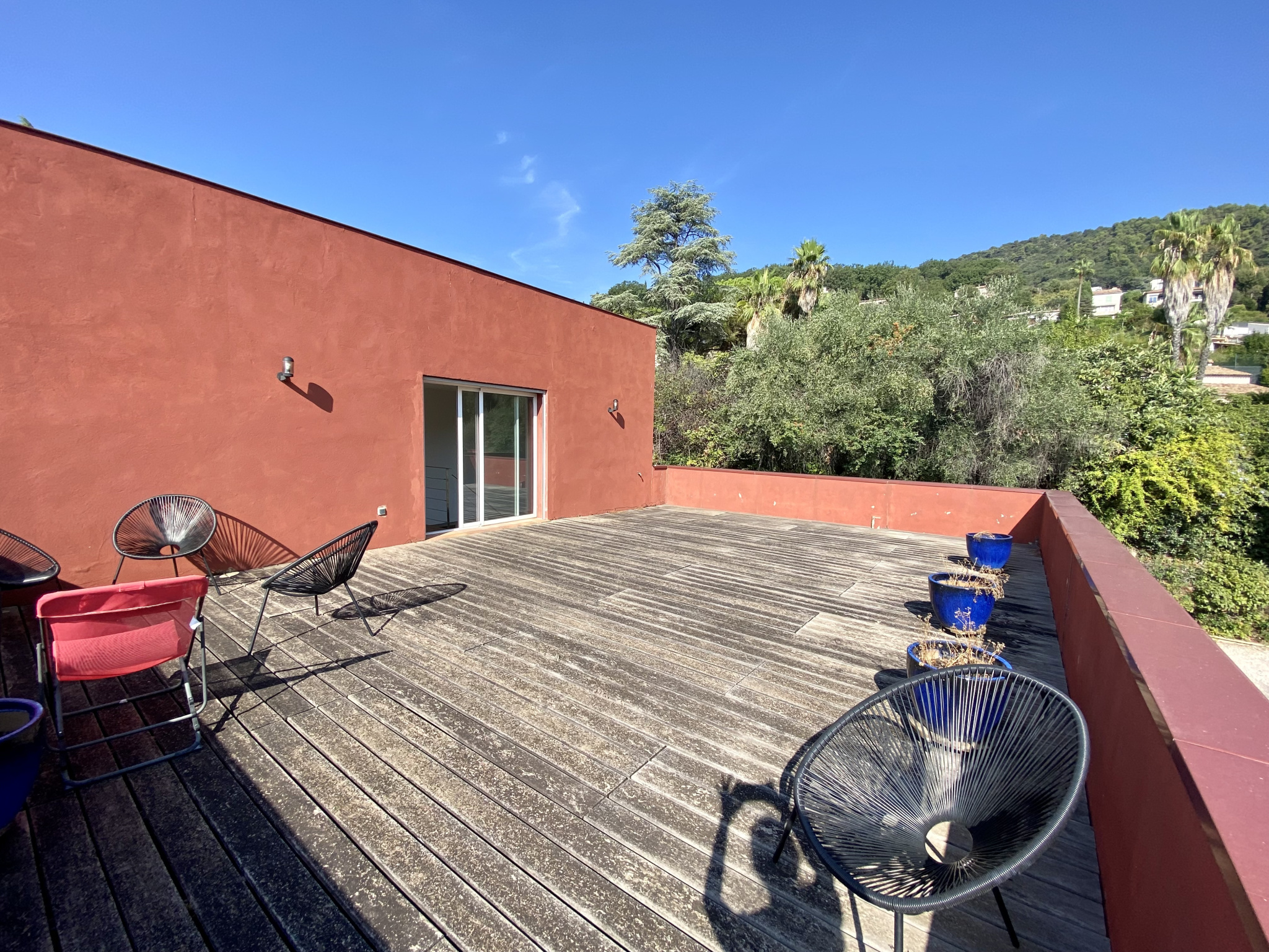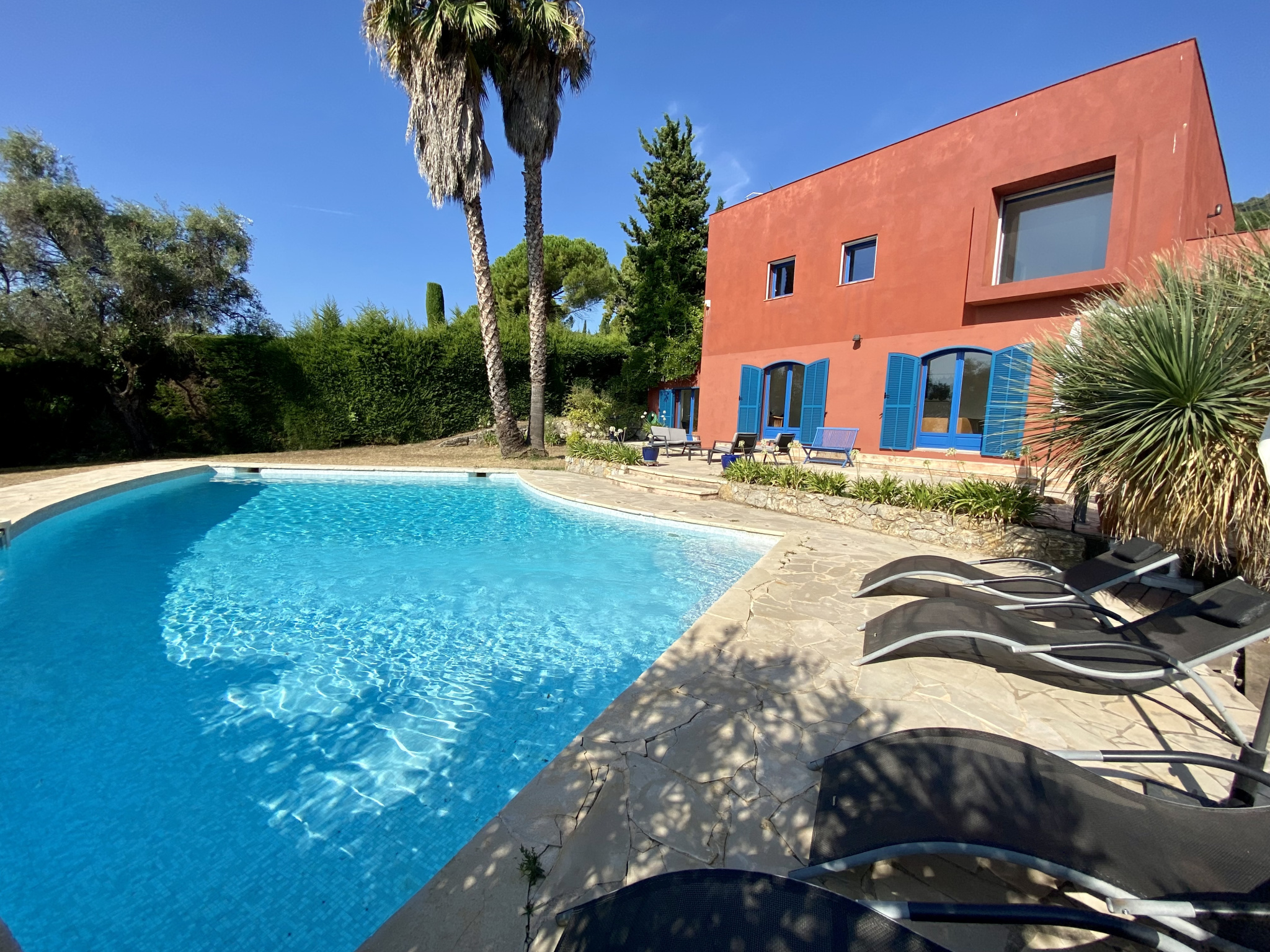 À Vence, à seulement 1 km du centre-ville, découvrez cette superbe villa d’architecte de 230 m², implantée sur un magnifique terrain plat de 1 700 m² agrémenté d’oliviers et d’une piscine. La villa s’organise principalement de plain-pied. Le rez-de-chaussée offre une entrée avec rangements, des WC invités, un vaste séjour de 62 m² sublimé par une cheminée suspendue, ainsi qu’une cuisine entièrement équipée avec un bel espace repas. Un bureau complète cet espace de vie. Un dégagement dessert une chambre avec salle de bains, une buanderie et un cellier. Toujours de plain-pied, la suite parentale d’environ 30 m² dispose d’un dressing, d’une salle de bains et de WC privatifs. À l’étage, une élégante passerelle mène à trois chambres, chacune avec placards, une salle d’eau et des WC indépendants. Le niveau accueille également une exceptionnelle terrasse en bois de 65 m² en roof-top, offrant de superbes vues sur les montagnes et la mer. À l’extérieur, les pièces de vie s’ouvrent sur une grande terrasse et une belle piscine, prolongées par le jardin paysager planté d’oliviers centenaires. En annexes, la propriété dispose d’un garage pouvant accueillir aisément deux véhicules ainsi que d’une cave de 29 m². Un stationnement extérieur est également possible pour plusieurs véhicules. Les informations sur les risques auxquels ce bien est exposé sont disponibles sur le site Géorisques : www.georisques.gouv.fr