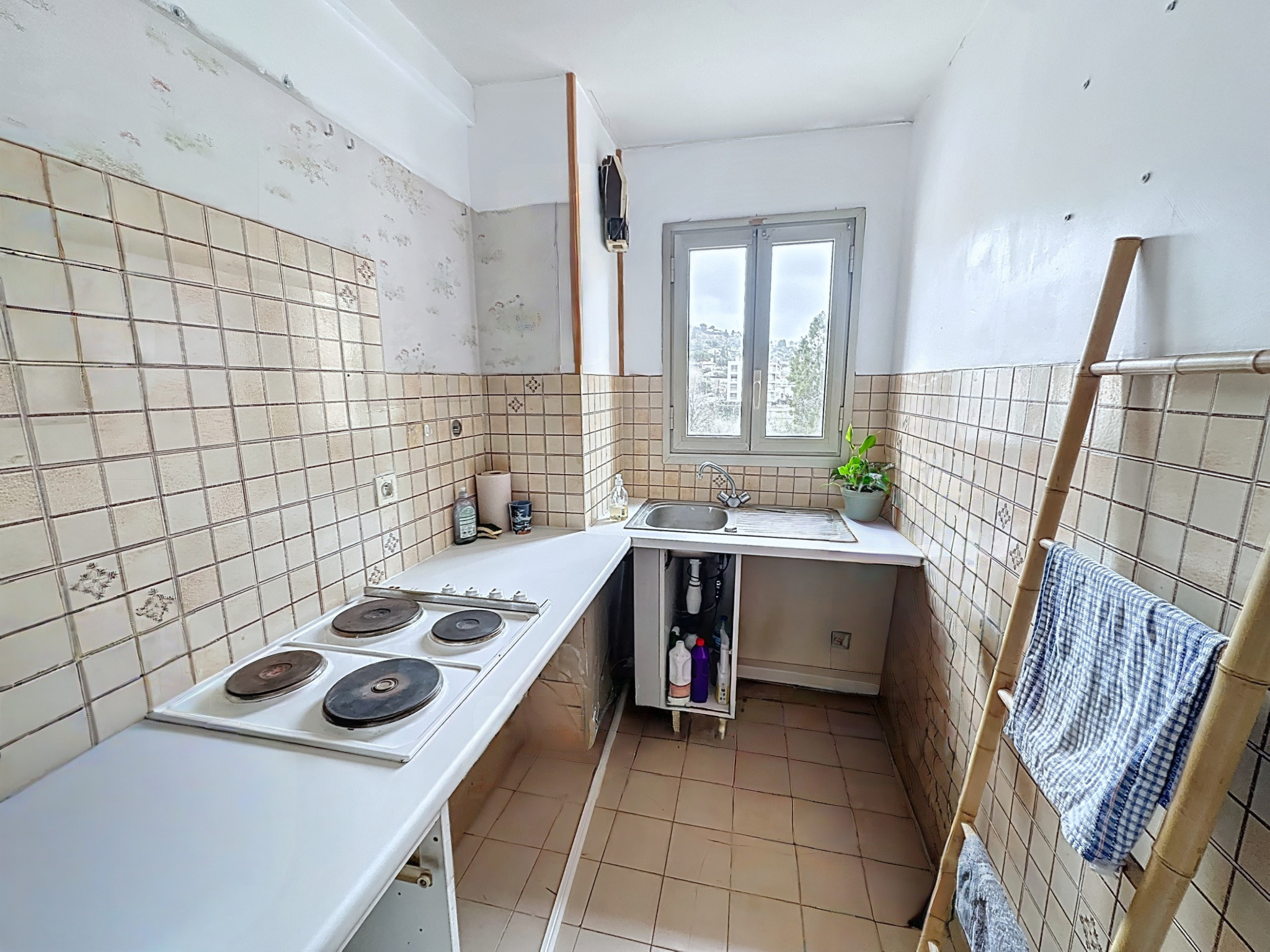 Le bien dispose d’une double exposition dans le séjour, de deux balcons et d’une orientation Nord-Est. La distribution est fonctionnelle : salon et chambre avec parquet récemment refait, climatisation installée, toilettes séparées, cuisine indépendante. Une rénovation est à prévoir sur la cuisine et la salle de bains.