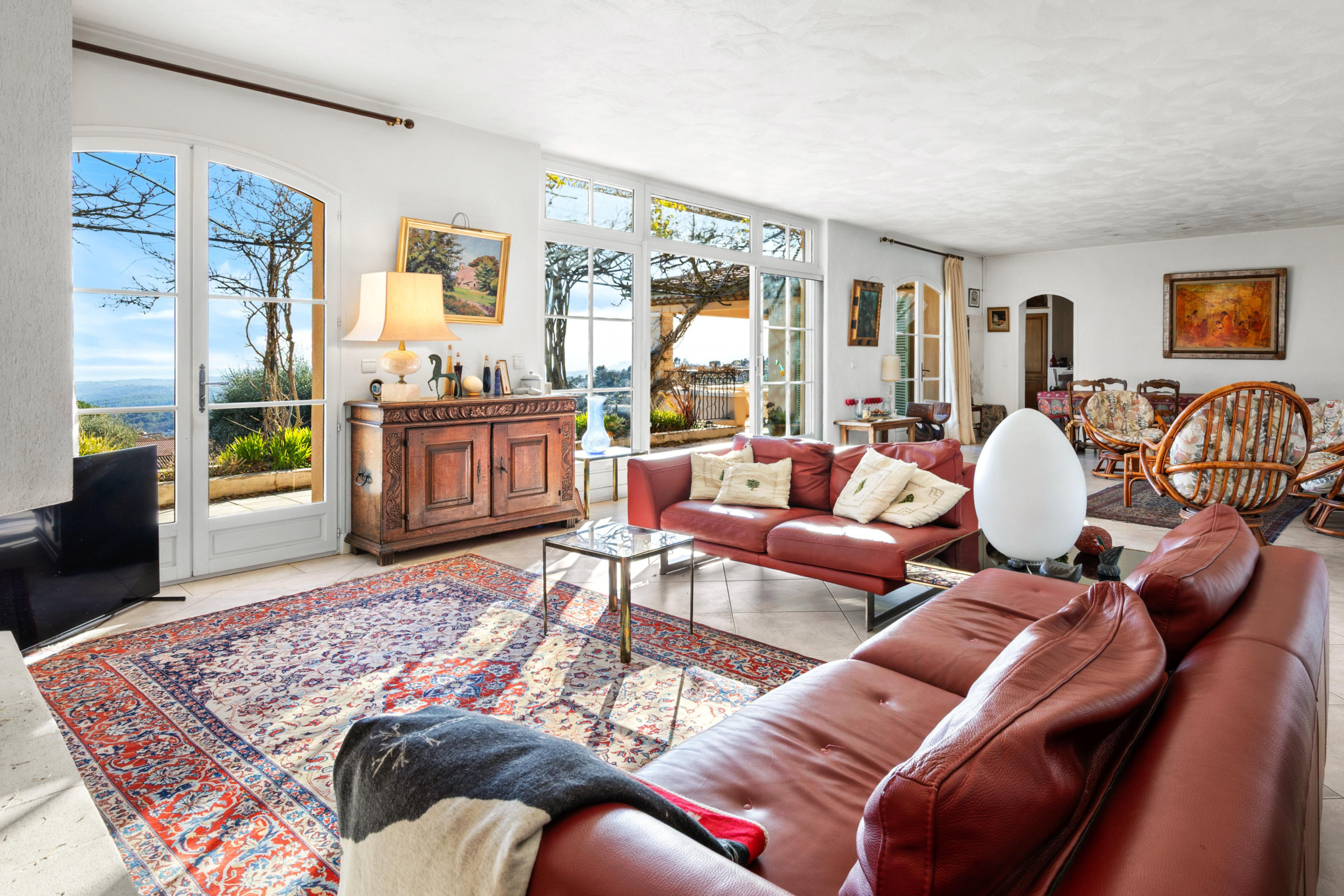Sur un beau terrain de 2 462 m² bénéficiant d’une vue panoramique sur la mer, cette propriété idéalement située dans le village de Tourrettes-sur-Loup offre un cadre de vie privilégié, entre charme provençal et douceur de vivre. D’une surface habitable totale de 225,74 m², la maison s’élève sur deux niveaux, pensés pour accueillir famille et amis dans une atmosphère chaleureuse. Au rez-de-chaussée, vous découvrez un hall d’entrée qui s’ouvre sur un séjour lumineux, propice aux moments de convivialité. La cuisine, fonctionnelle et agréable, donne directement accès à une terrasse où il fait bon profiter des beaux jours. Ce niveau comprend également deux chambres, une salle de bains avec toilettes, une salle d’eau ainsi que des toilettes séparées. À l’étage, un dégagement dessert quatre chambres spacieuses, idéales pour une grande famille ou pour recevoir. Vous y trouverez également une salle de bains, une salle d’eau avec toilettes et des toilettes séparées. La propriété dispose en outre d’un vaste sous-sol partiellement aménagé, comprenant un atelier, une chaufferie, une cave, une cave à vin et des toilettes, ainsi qu’un vide sanitaire, offrant de nombreux espaces de rangement et de possibilités d’aménagement. À l’extérieur, vous profiterez d’une piscine accompagnée de son pool house, parfait pour les journées d’été, ainsi que d’un garage. Une maison familiale pleine de charme, dans un environnement exceptionnel, invitant à profiter pleinement de la beauté de la Côte d’Azur. N’hésitez pas à nous contacter pour organiser une visite et découvrir par vous-même tout le charme de cette propriété.