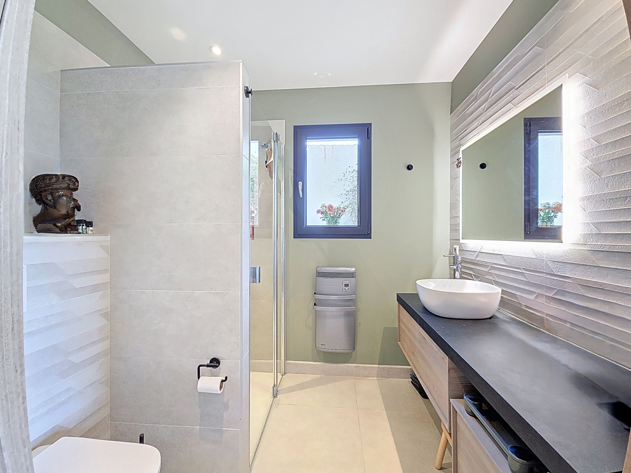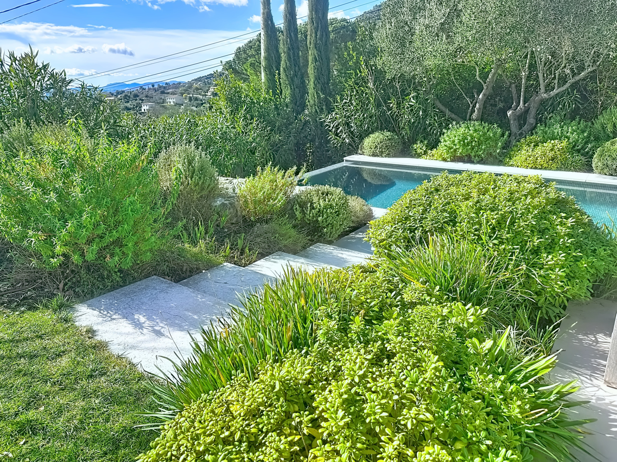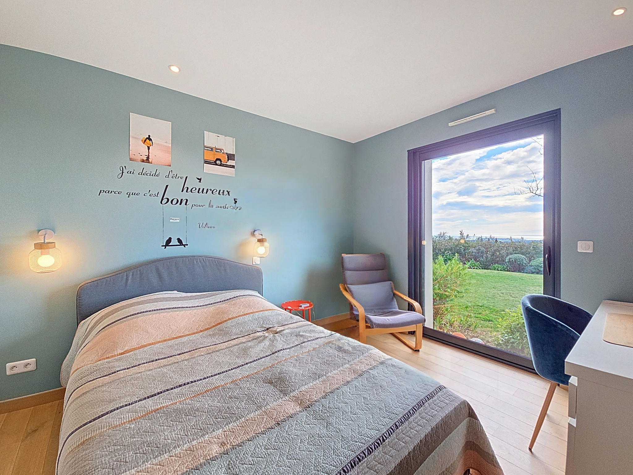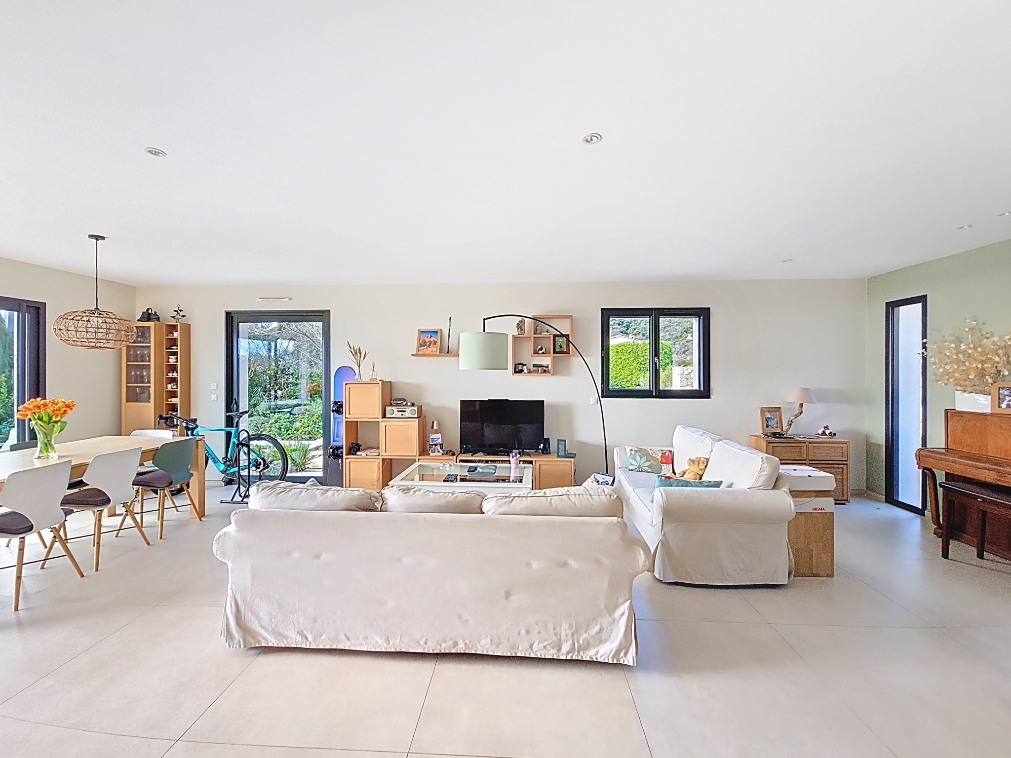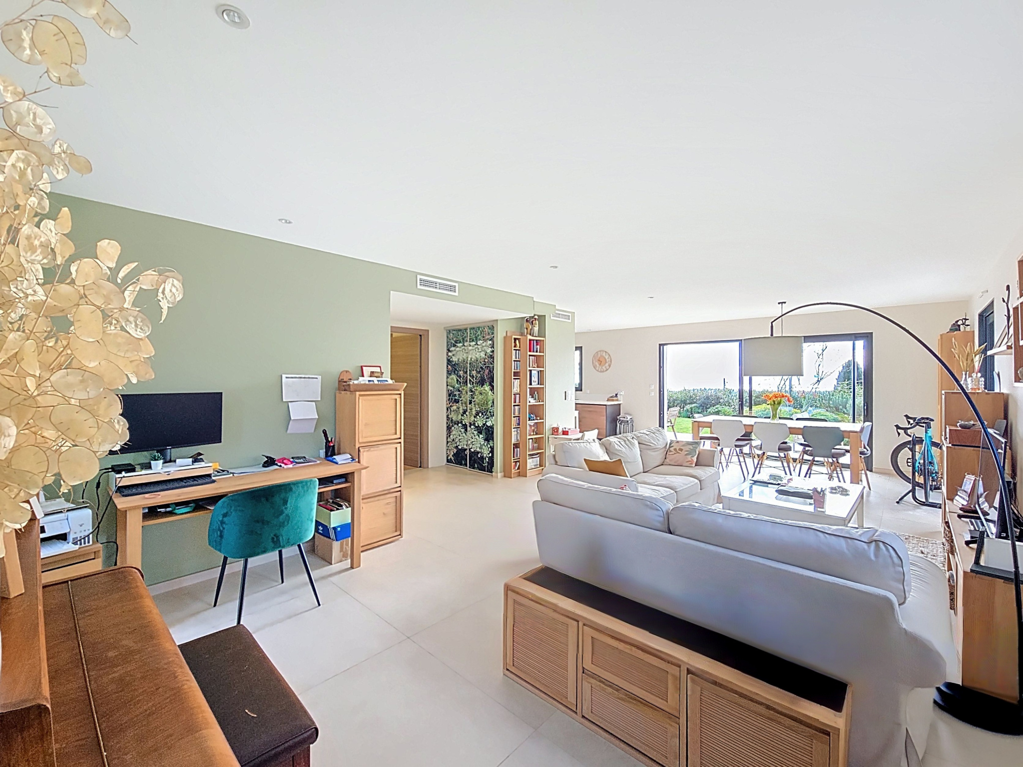 À quelques minutes à pied du village, au calme absolu, découvrez cette villa contemporaine de plain-pied d’environ 140 m², offrant une vue panoramique exceptionnelle jusqu’à la mer et l’Esterel. Implantée sur un terrain paysager de 906 m², entièrement plat et soigné, la propriété offre des extérieurs particulièrement agréables : une élégante piscine à débordement, une vaste terrasse conviviale, un espace dédié au trampoline et un environnement verdoyant harmonieusement aménagé. La maison propose une belle pièce de vie lumineuse, ouverte par de larges baies vitrées sur l’extérieur, ainsi qu’une cuisine moderne. L’espace nuit comprend une suite parentale avec dressing et salle d’eau, trois chambres supplémentaires et deux salles de bains/douches. Buanderie, un garage et plusieurs places de stationnement complètent les prestations. Une villa alliant confort, fonctionnalité et cadre privilégié. Un bien rare sur le secteur, à visiter sans tarder ! Estimation des dépenses annuelles d'énergie du logement (2023) : entre 553 € et 749 €. Les informations sur les risques auxquels ce bien est exposé sont disponibles sur le site Géorisques : www.georisques.gouv.fr